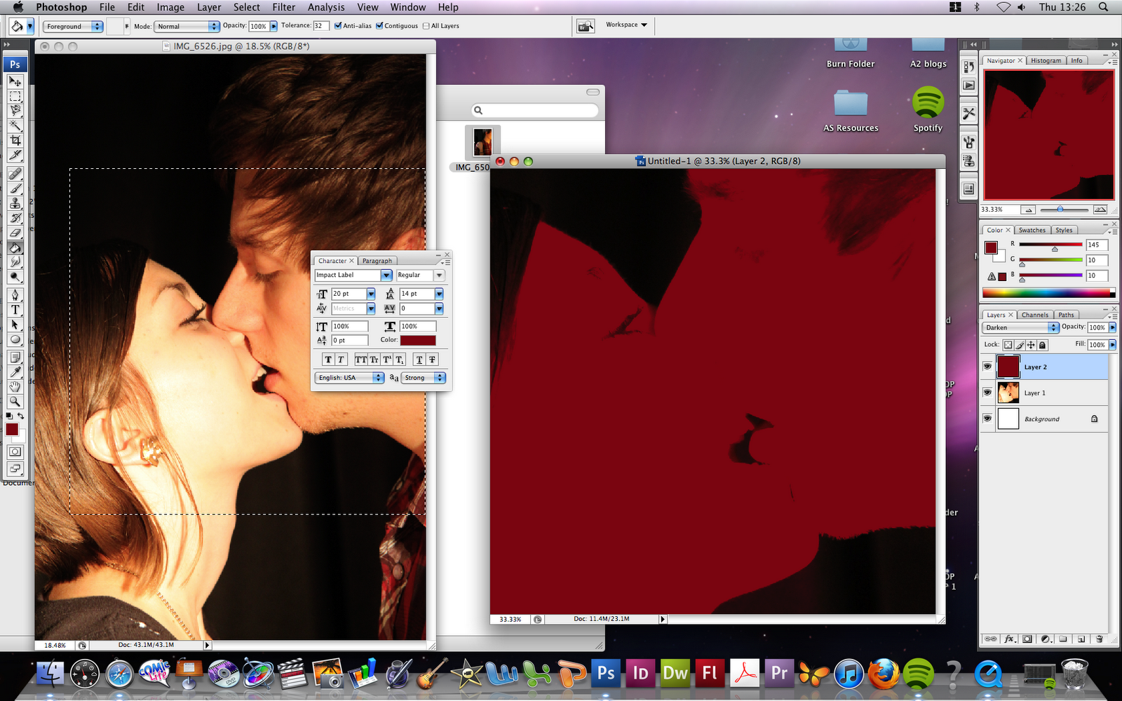 When constructing my Magazine Advertisement to promote my digipak, I wanted the advertisement to have a great parity with the digipak, due to fact that that is what is is promoting. As a result of this I decided to use the original image from my front cover of my digipak for my advertisement, edited in the same way. I began by taking the same steps with the larger, less cropped image as I did to edit the front cover of the digipak, by first adding a dark red filter.